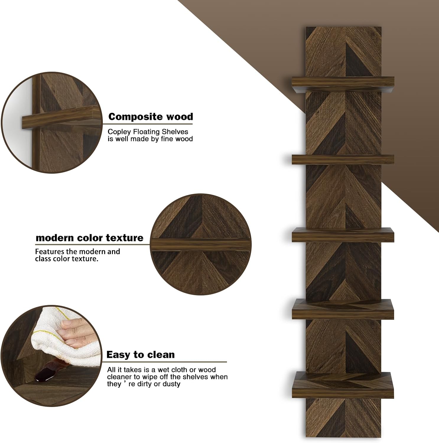 Bring some space-saving innovation and timeless appeal to your living space with the Bloddream. Spine Wall Shelf. Perfect for putting small potted succulents on display, staging framed family photos, and letting knick-knacks draw the eye, this shelf takes your ensemble upwards. Crafted from durable MDF composite with a laminated finish, this wall-mounted storage unit has five sturdy open shelves with a clean-lined silhouette and a neutral walnut finish. Easy to install with the enclosed mounting hardware. Includes five small shelves are ideal for CD's, small rolled towels, family photos, potted suculents or small collectibles. Contemporary style and creative design. Space saving solution for small walls or columns.