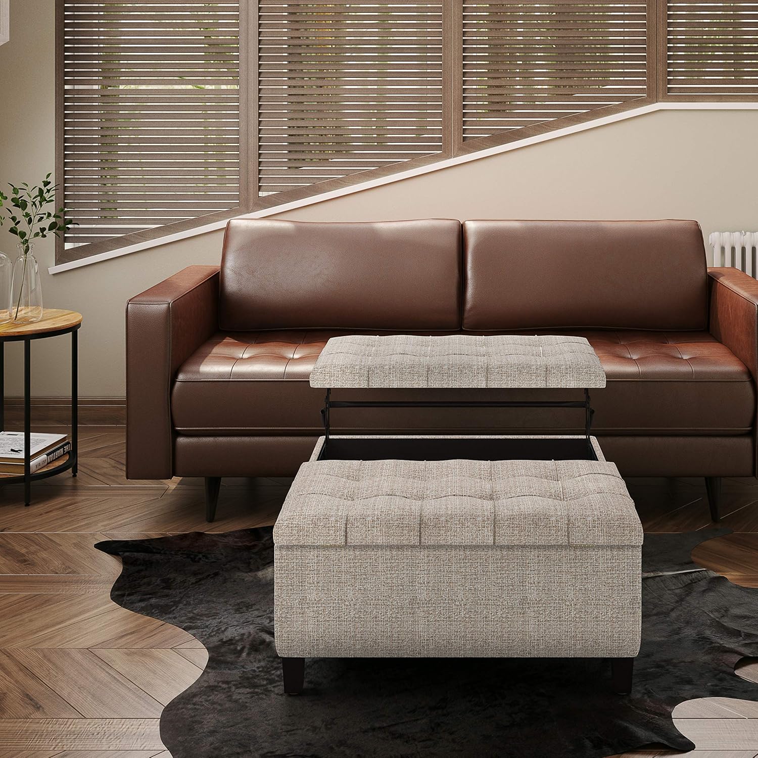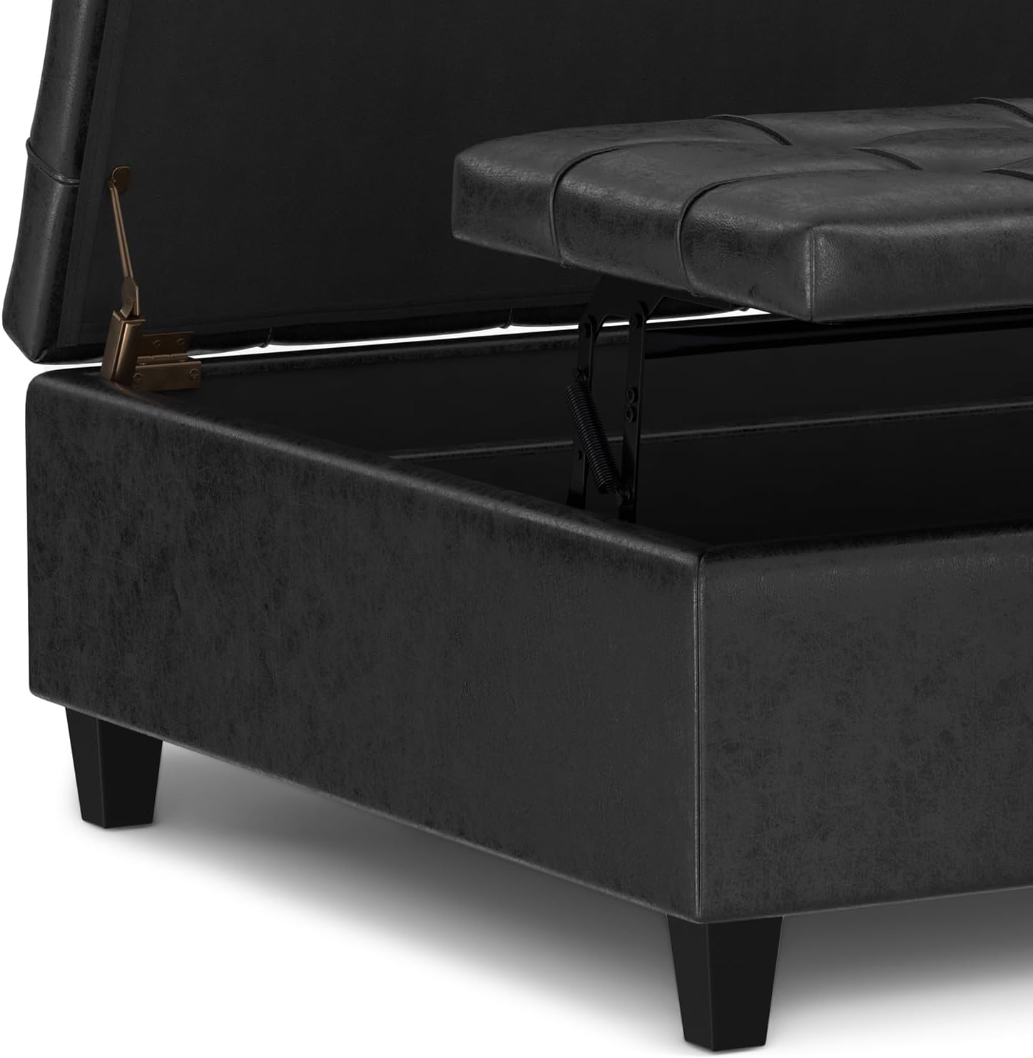 Maximize the space in your living room or family room with the Harrison Small Coffee Table Storage Ottoman. The contemporary, yet functional design of the ottoman makes it a necessity for any home. The lift up top features stylish tufted details and the large interior space is the perfect solution for your storage needs.