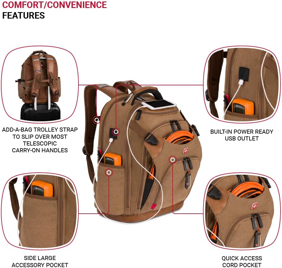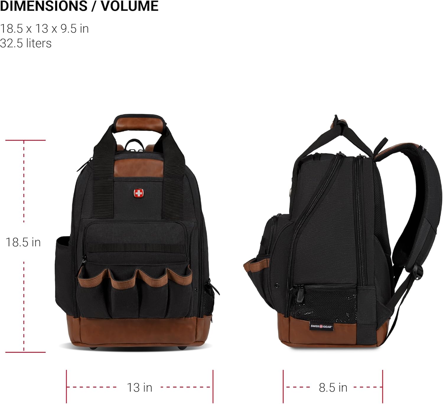 The SwissGear 18.5-inch laptop backpack marries contemporary design with innovative storage solutions. This backpack means business; features like the padded laptop compartment and dedicated tablet pocket prevent drop damage to your personal tech. The large main compartment with clear PVC pocket, hook and loop closure pocket, and removable tool caddy with 34 available organizer slots. Stay cool under pressure with airflow back padding and shock-absorbing shoulder straps.