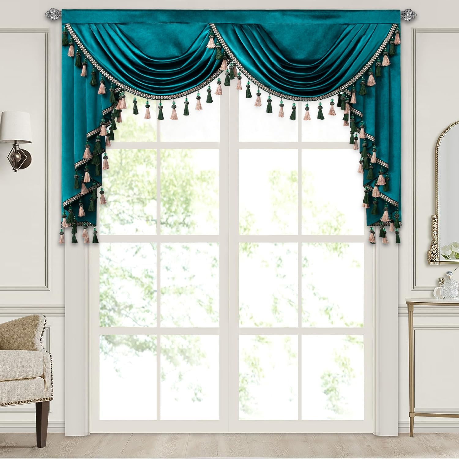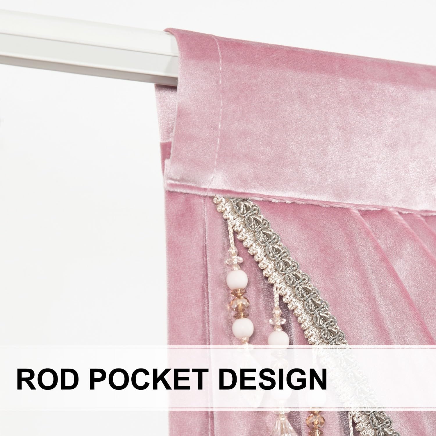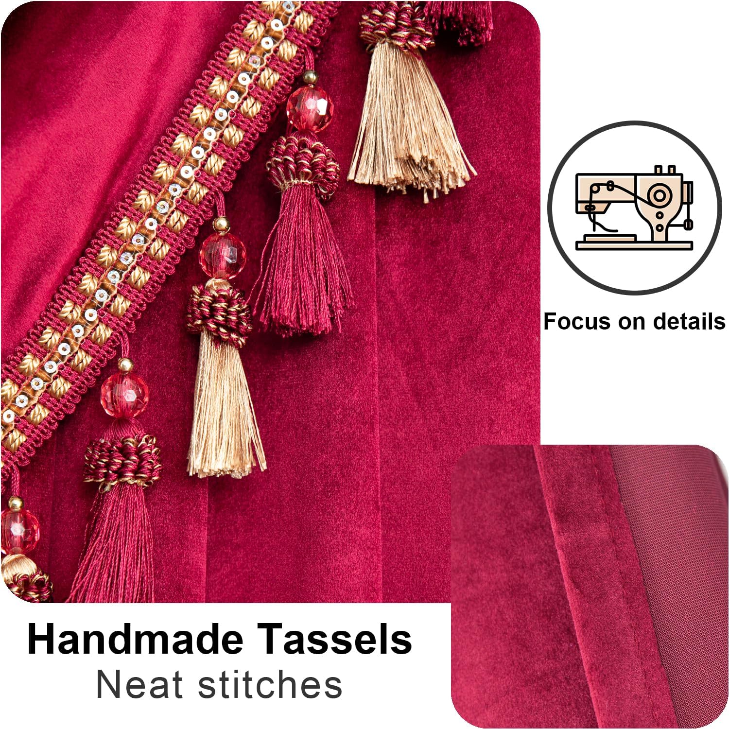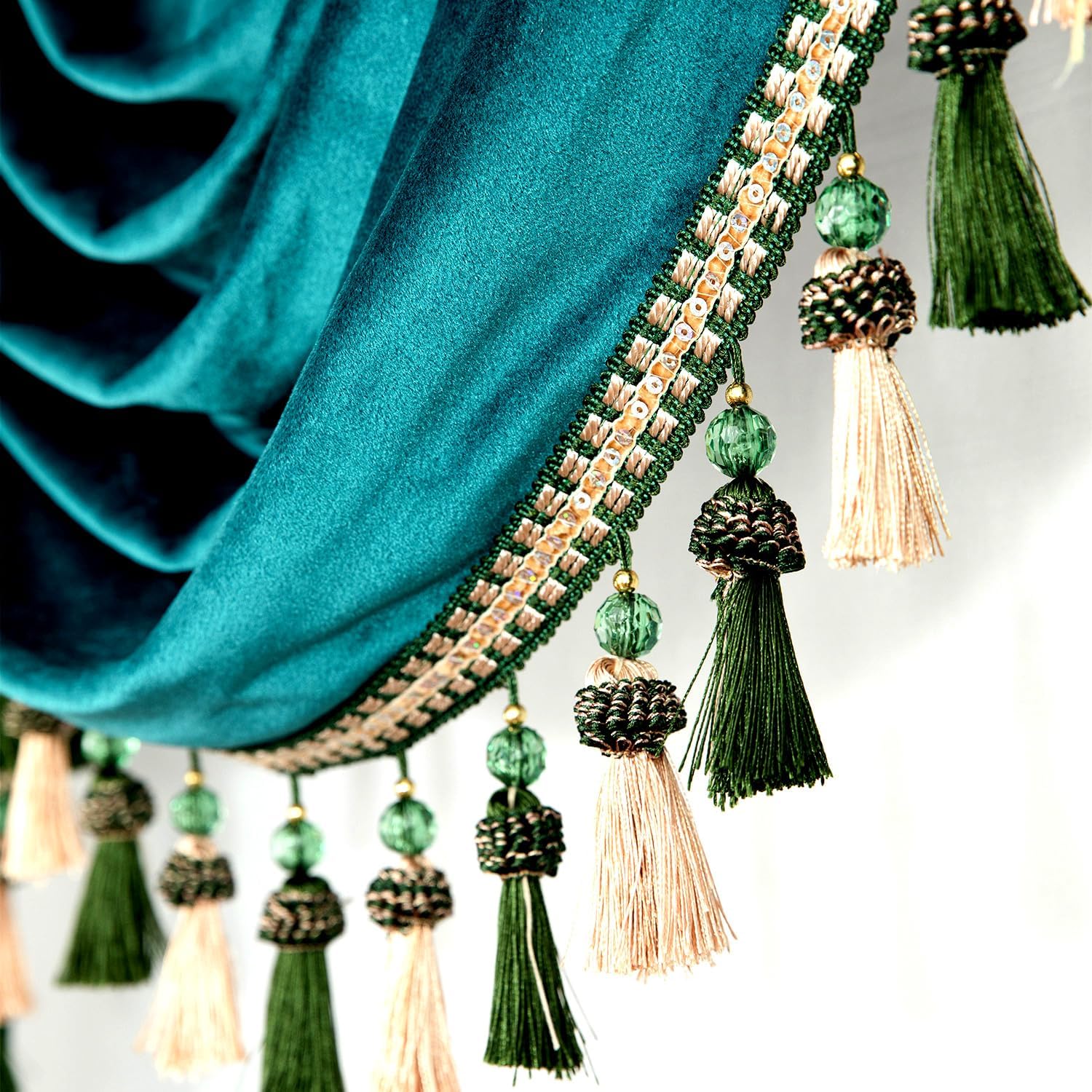 | Special Feature | Handmade Tassel Trim, Light Filtering, Retro European Style, Rod Pocket Header, Super Soft Velvet Fabric |