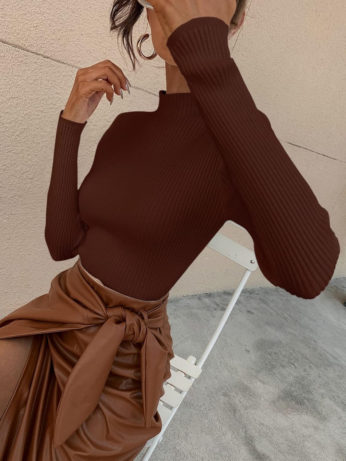 XSBicep Length : 6.5 inchBust : 24.4 inchCuff : 5.1 inchLength : 21.7 inchShoulder : 12.2 inchSleeve Length : 22.4 inchSBicep Length : 7.1 inchBust : 26 inchCuff : 5.5 inchLength : 22 inchShoulder : 12.6 inchSleeve Length : 22.8 inchMBicep Length : 7.7 inchBust : 27.6 inchCuff : 5.9 inchLength : 22.4 inchShoulder : 13 inchSleeve Length : 23.2 inchLBicep Length : 8.5 inchBust : 29.9 inchCuff : 6.5 inchLength : 23 inchShoulder : 13.6 inchSleeve Length : 23.8 inchColor: White,Coffee Brown,Black,Camel,Burgundy,Lilac Purple,Coral Pink,Rose Red,Hot Pink,Blue,ApricotStyle: Basics,CasualPattern Type: PlainDetails: Rib-KnitType: Basic TopsNeckline: Stand CollarSleeve Length: Long SleeveSleeve Type: Regular SleeveLength: RegularFit Type: Slim FitFabric: High StretchMaterial: ,ElastaneComposition: 60% Elastane,40% PolyesterCare Instructions: Machine wash or professional dry cleanSheer: No